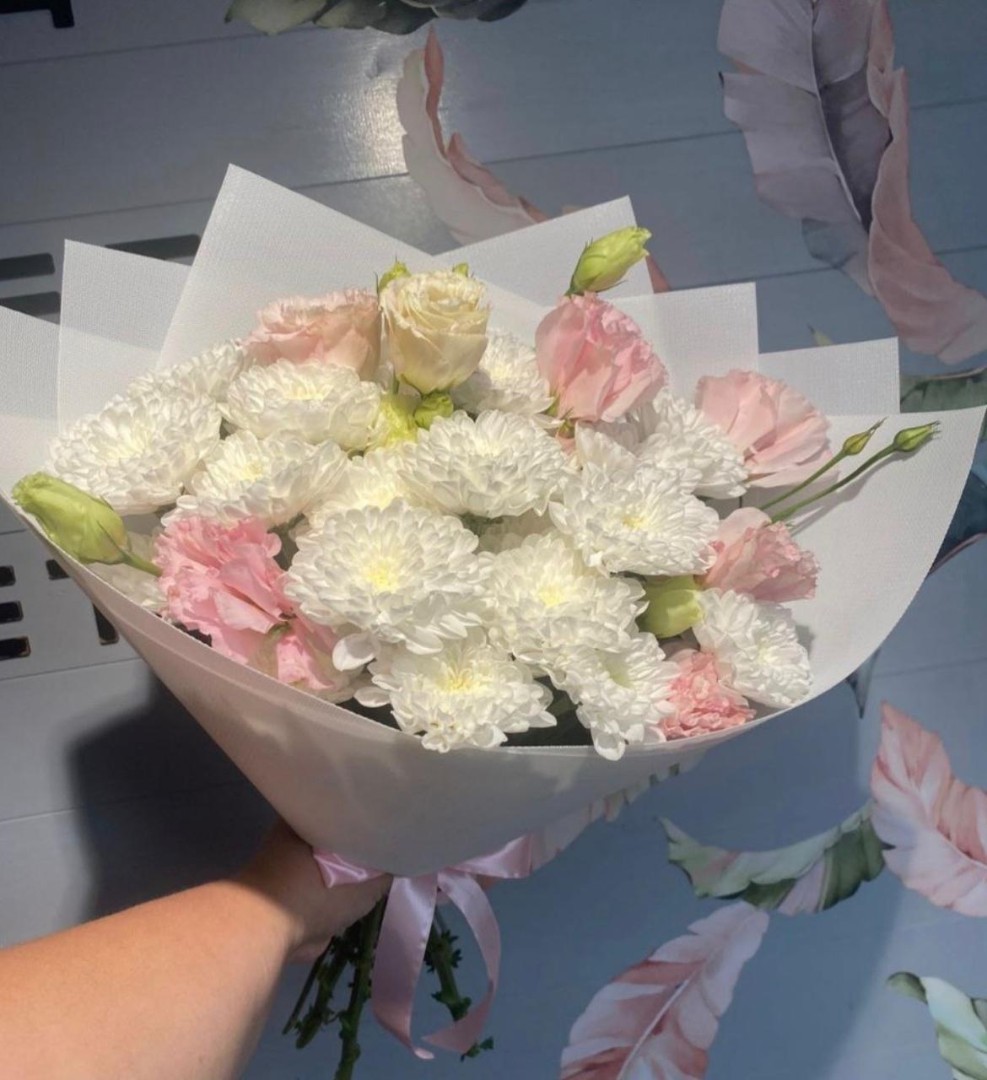 МИКСБУКЕТ С РОЗАМИ И ХРИЗАНТЕМАМИ «СНЕЖНАЯ ЗИМА»