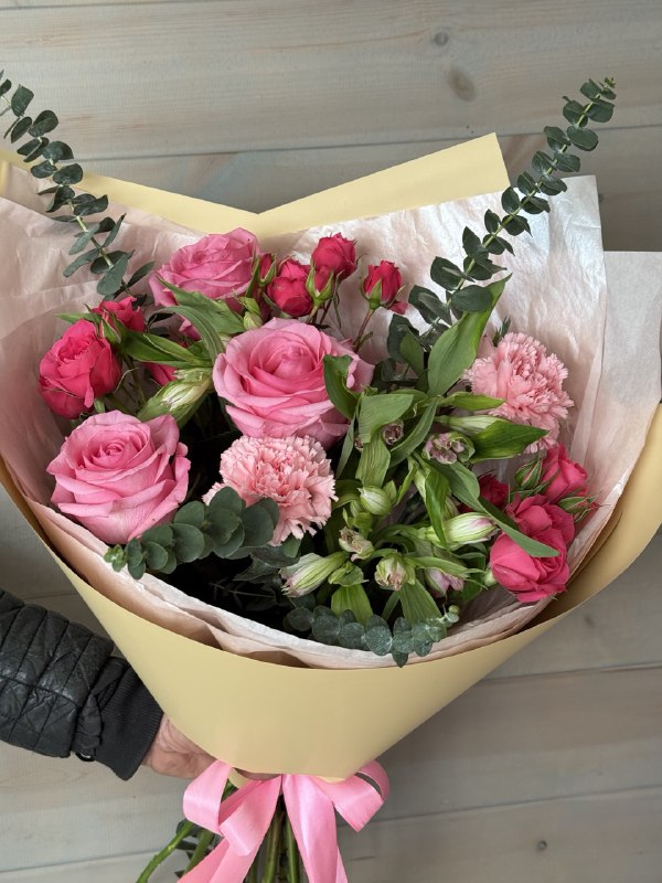 Роза 3 шт, диантусы 2 шт, альстромерия 3 шт, роза кустовая 3 шт, упаковка, лента атласная