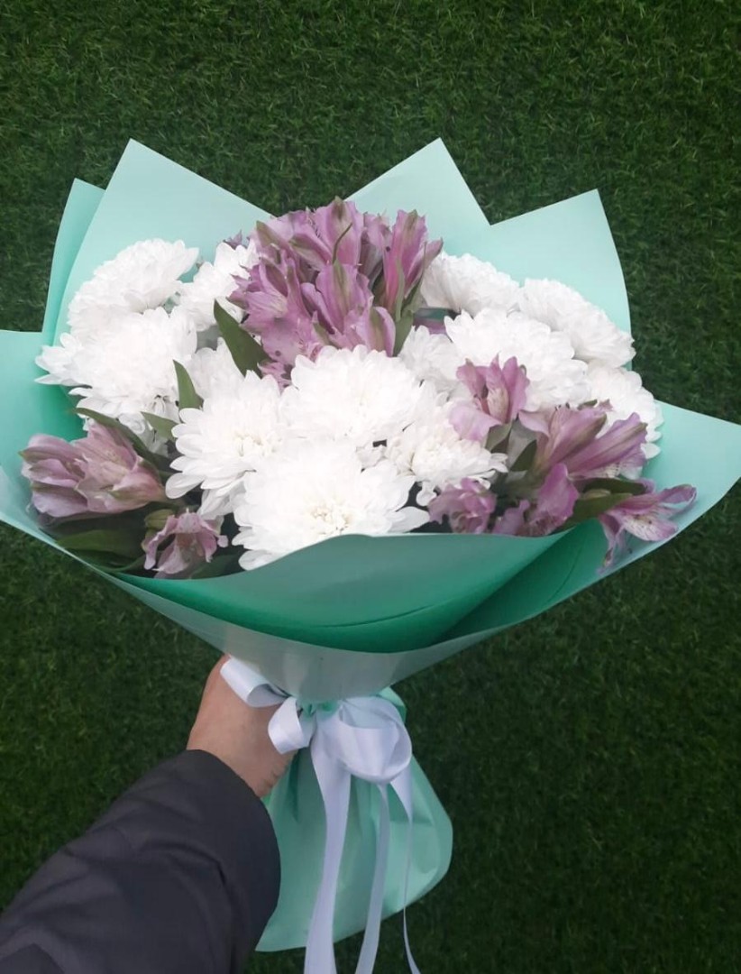 Хризантема кустовая 3 шт, альстромерия 4 шт, упаковка, лента атл.