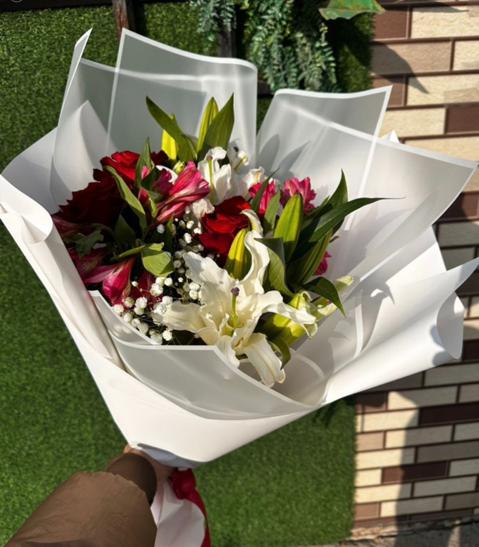 Роза 4 шт, Лилия 2 шт, Альстромерия 3 шт, Гипсафила 1 шт , упаковка, лента атласная