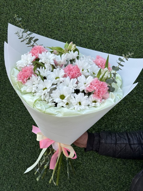 Хризантема 5 шт, альстромерия 3 шт, диантусы 5 шт, упаковка, лента атласная