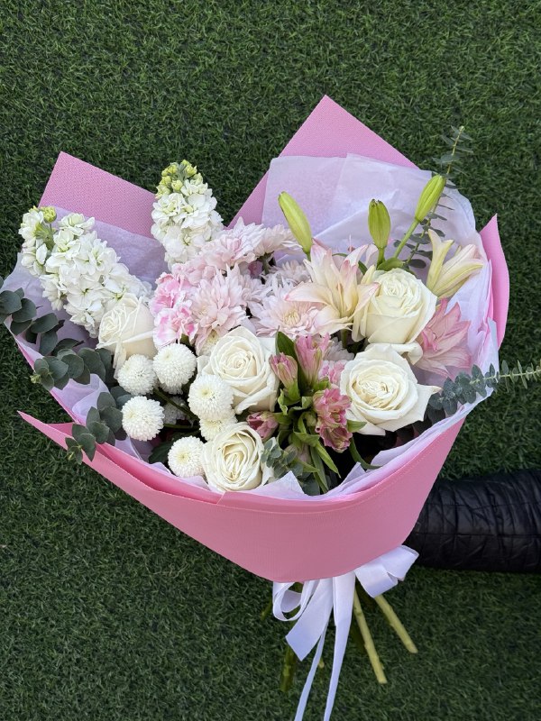 Роза 5 шт, Хризаантема кустовая, маттиола 2 шт, лилия 1 шт, альстромерия 1 шт, гвоздика 2 шт, зелень, упаковка, лента атласная