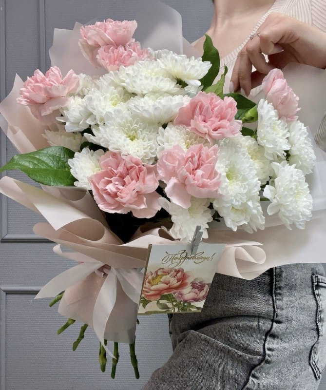 Хризантема кустовая 3 шт, Диантусы 7 шт, упаковка, лента атласная