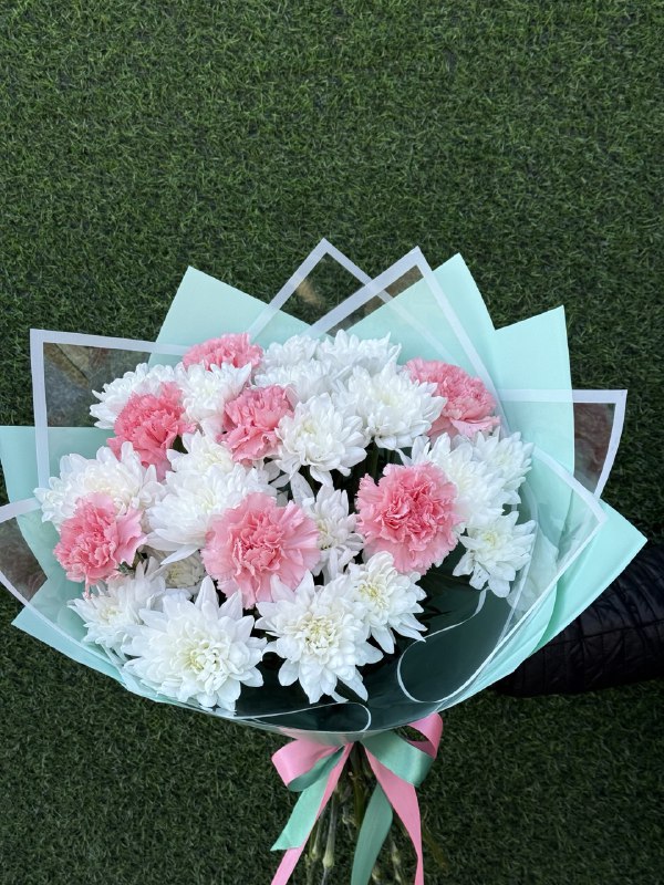 Хризантема кустовая 4 шт, Диантусы 7 шт, упаковка, лента атласная
