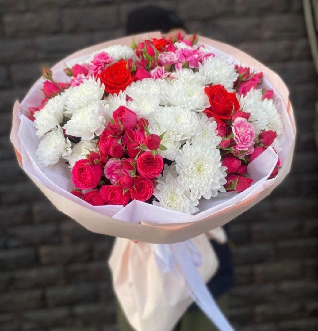 Хриза куст.6 шт, роза куст. 9 шт, роза одн. 3 шт, диантусы 5 шт, упаковка, лента атл