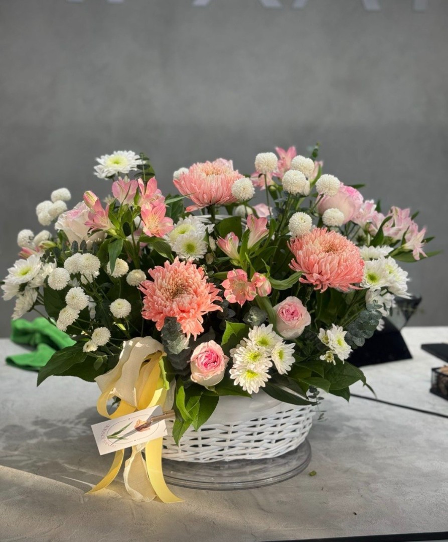 Корзина, пиафлор, цветы в ассортименте